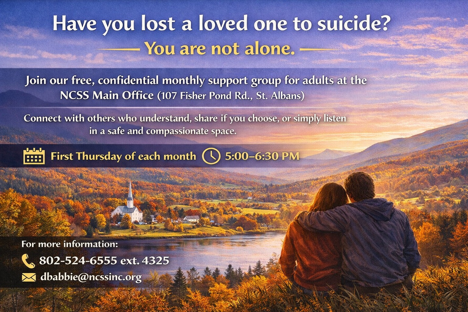 Have you lost a loved one to suicide? You are not alone. Join our free, confidential monthly support group for adults at the NCSS Main Office (107 Fisher Pond Rd.,...